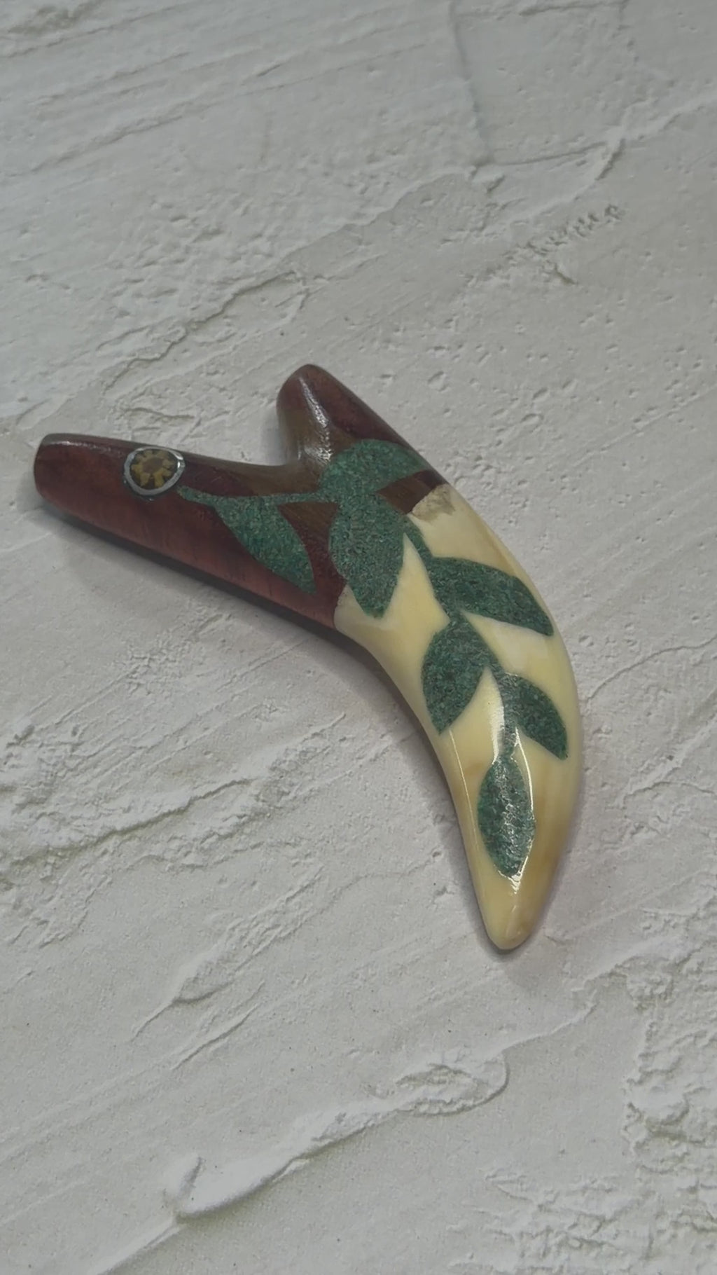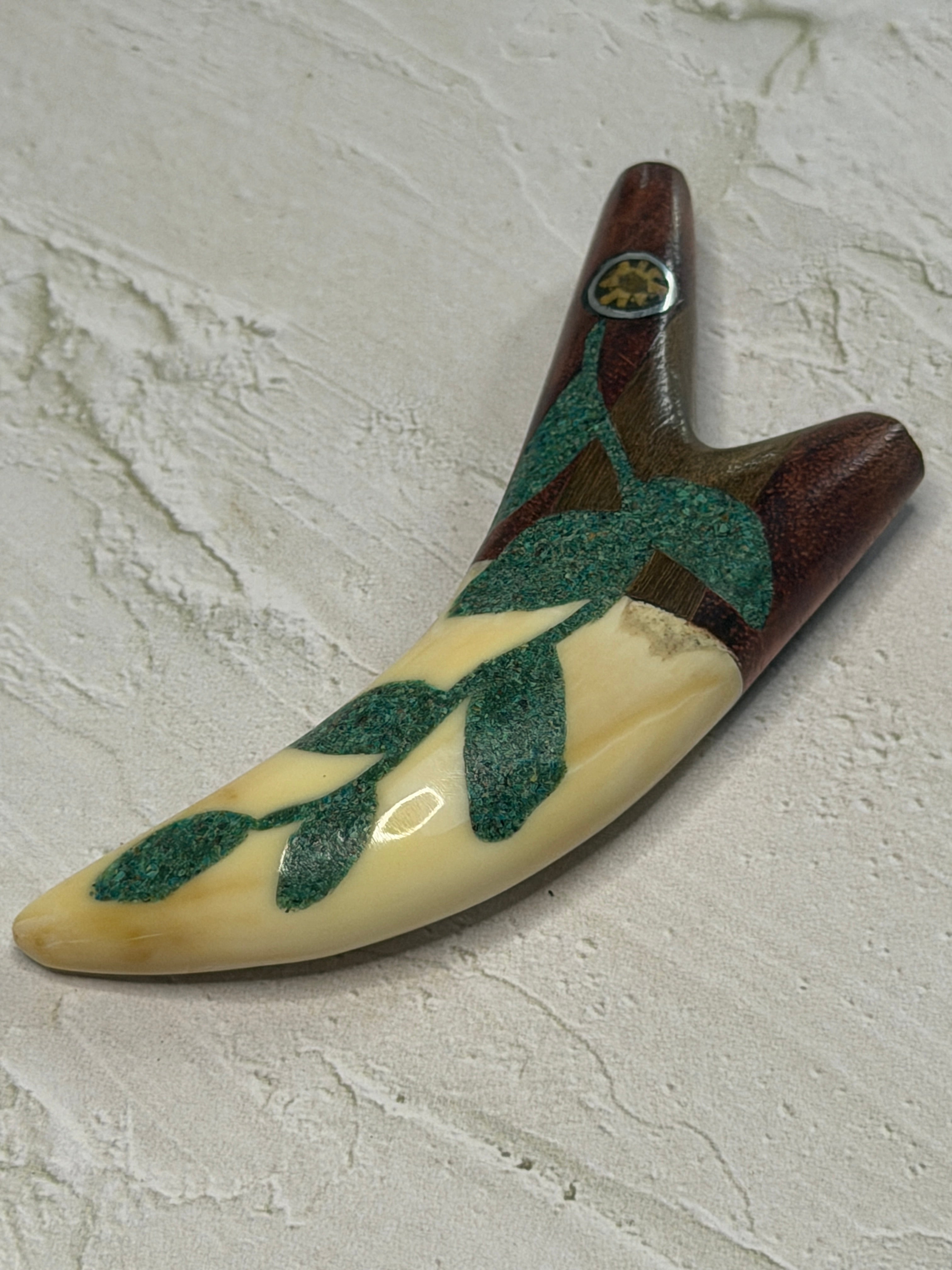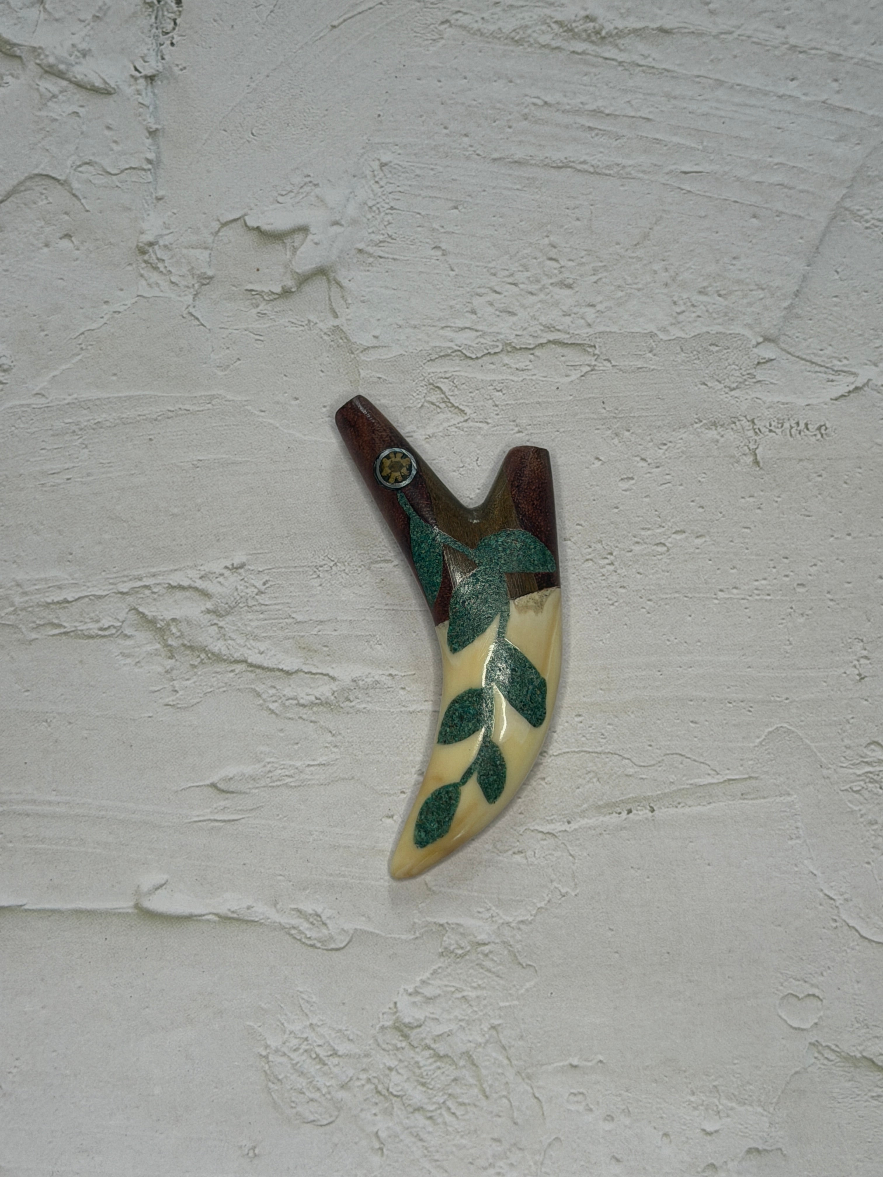 Flowing along the body, the green inlay forms the shape of tobacco leaves, crafted from crushed turquoise stone. The leaf design adds movement and meaning, honoring one of the most respected plant allies of the forest.