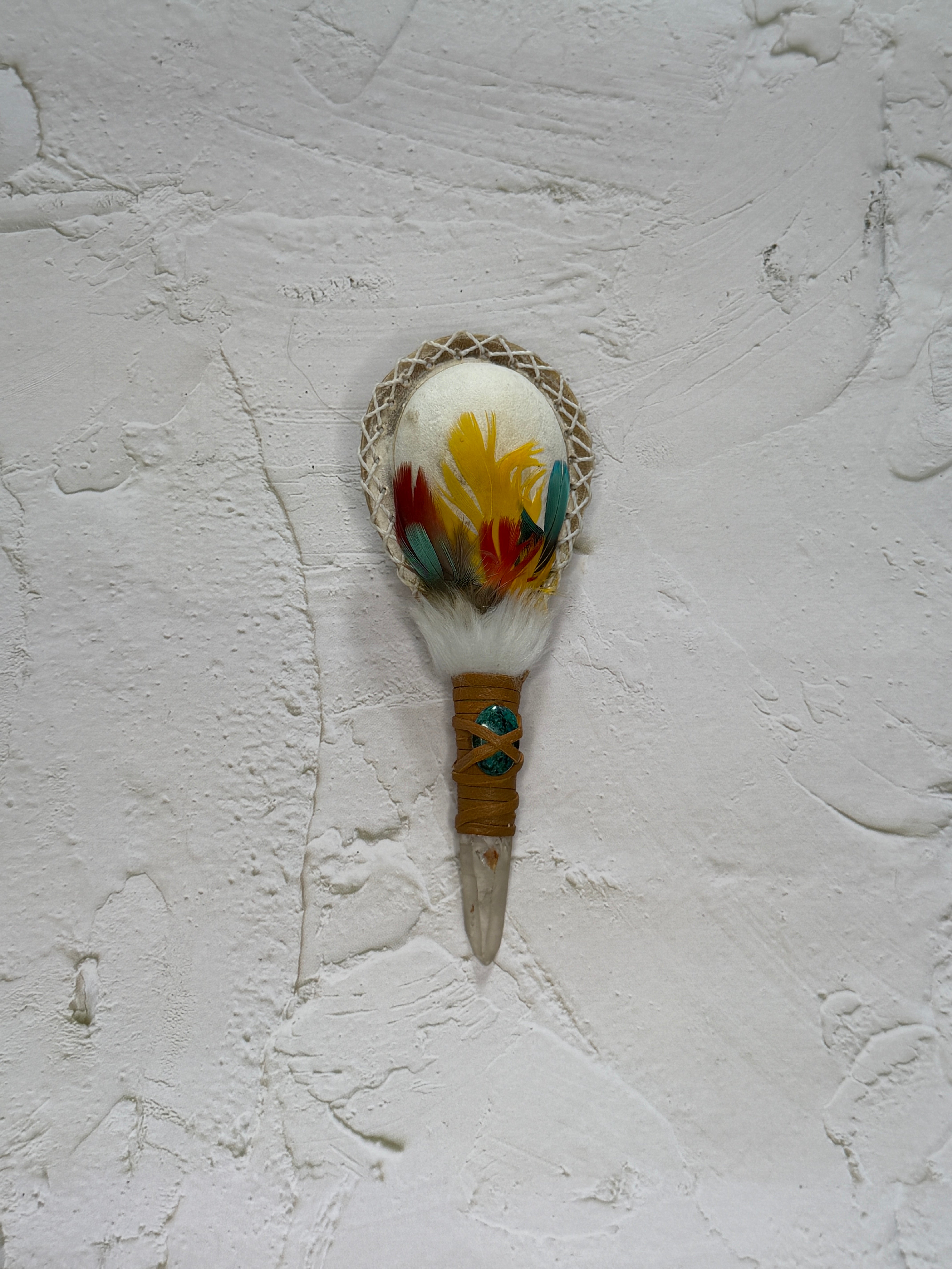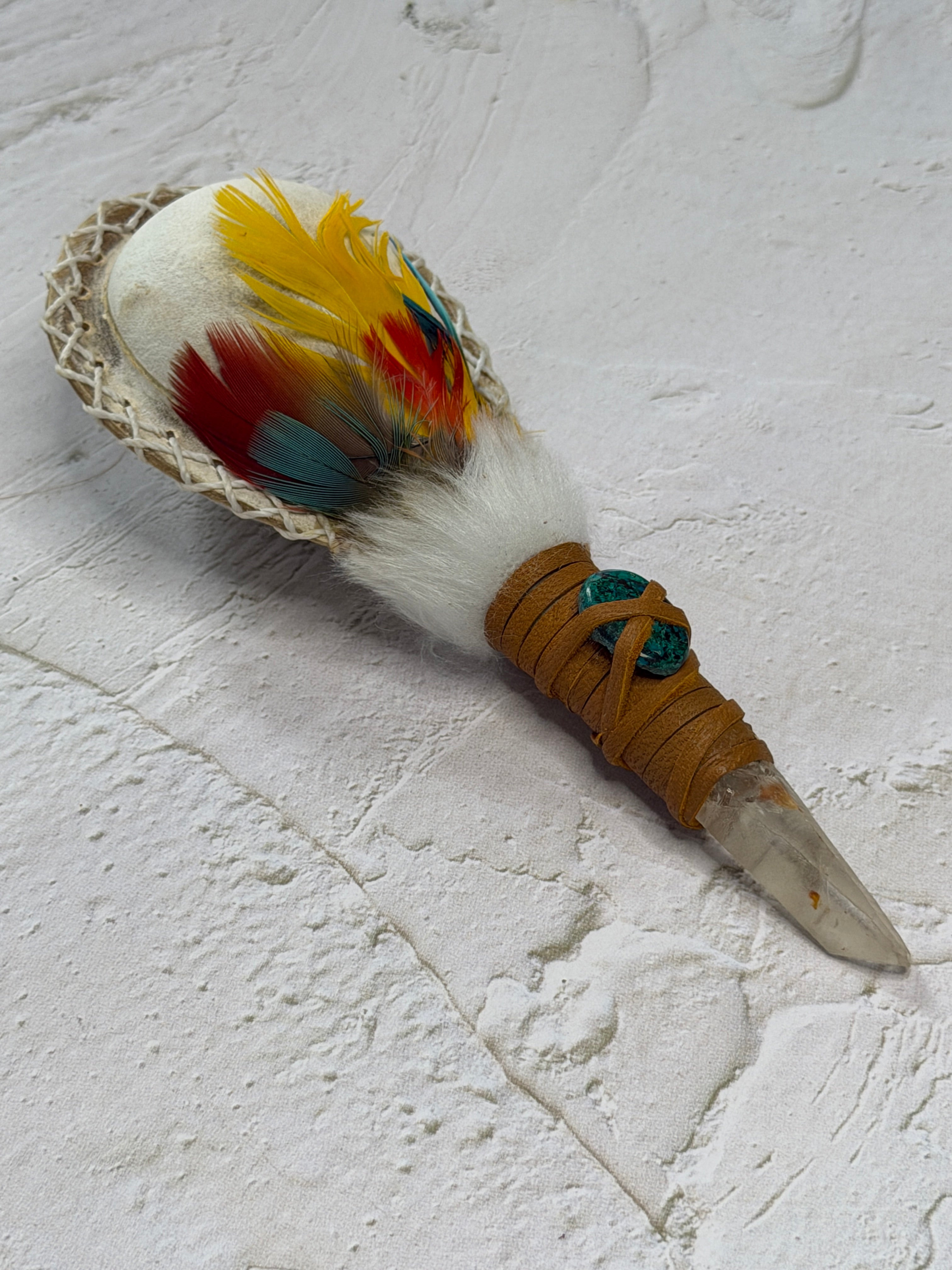 Each rattle is handmade using natural materials. Variations in feather shape, stone tone, and leather texture are natural and part of its unique spirit.