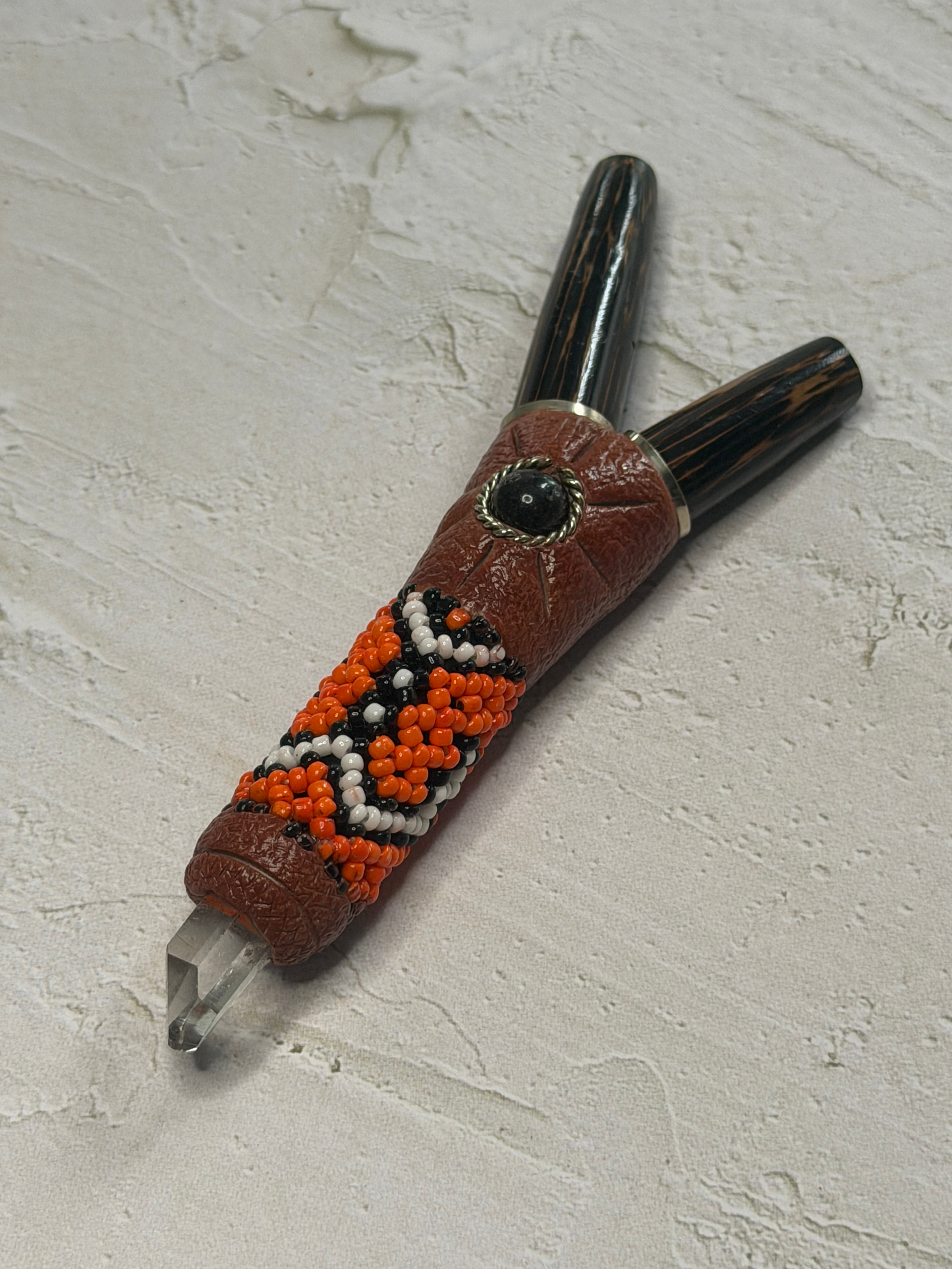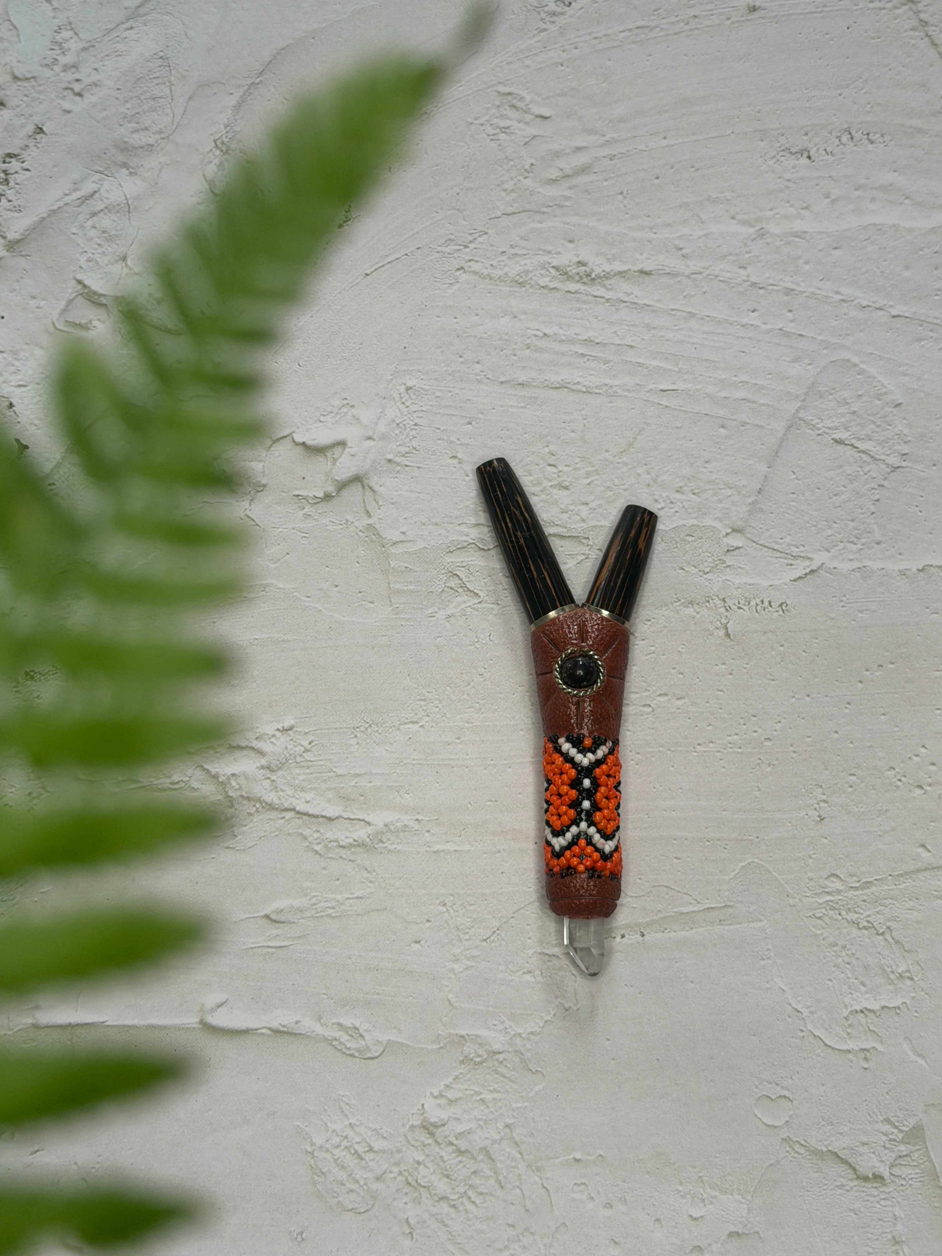 Our Shipibo Chonta Kuripes represent a perfect union of Amazonian traditions, combining sacred Chonta palm wood with intricate Shipibo beadwork. Each piece is carefully crafted through collaboration between skilled wood artisans and Shipibo artists, creating ceremonial tools that unite the strength of Chonta with the healing patterns of Shipibo art.