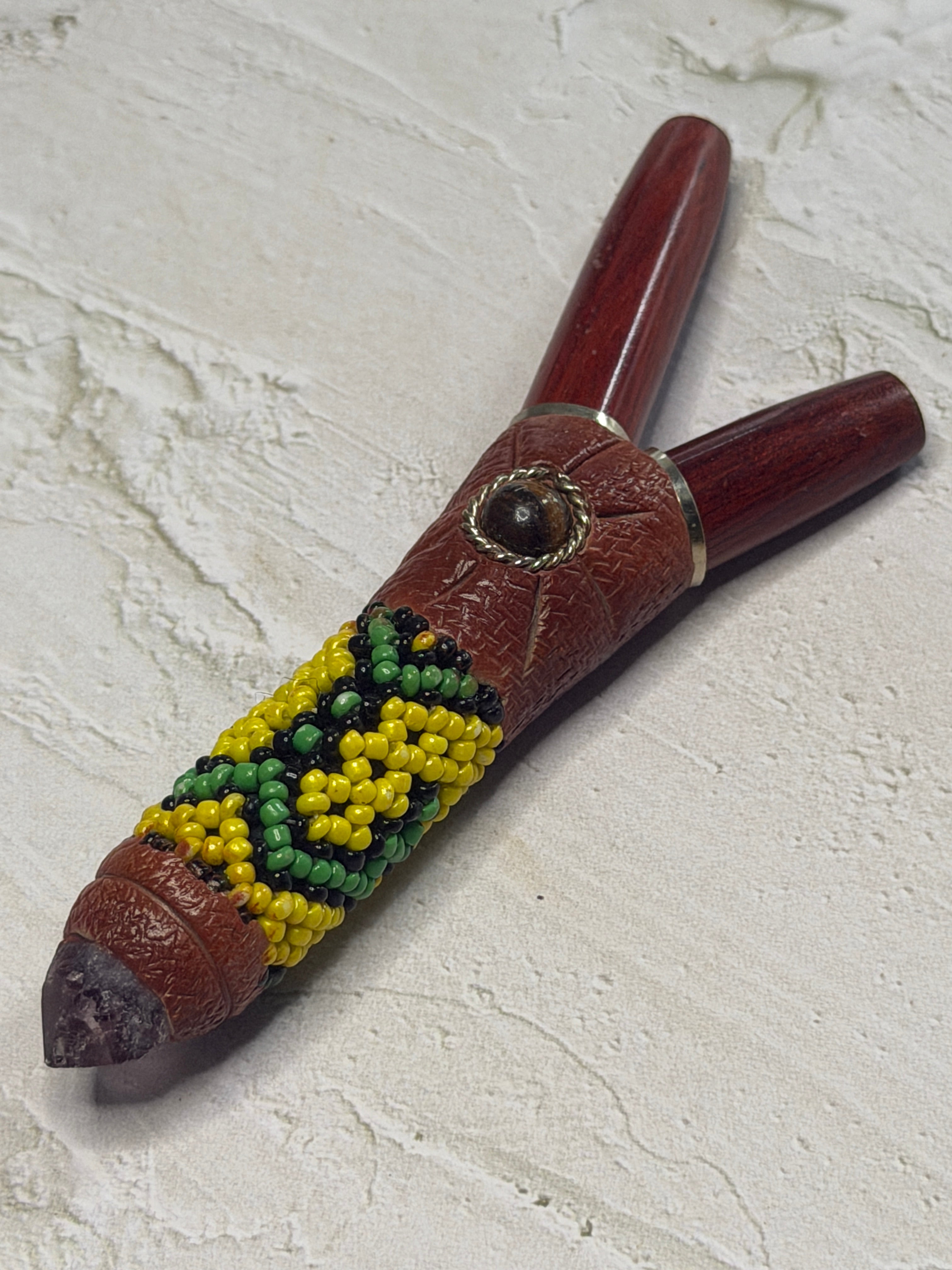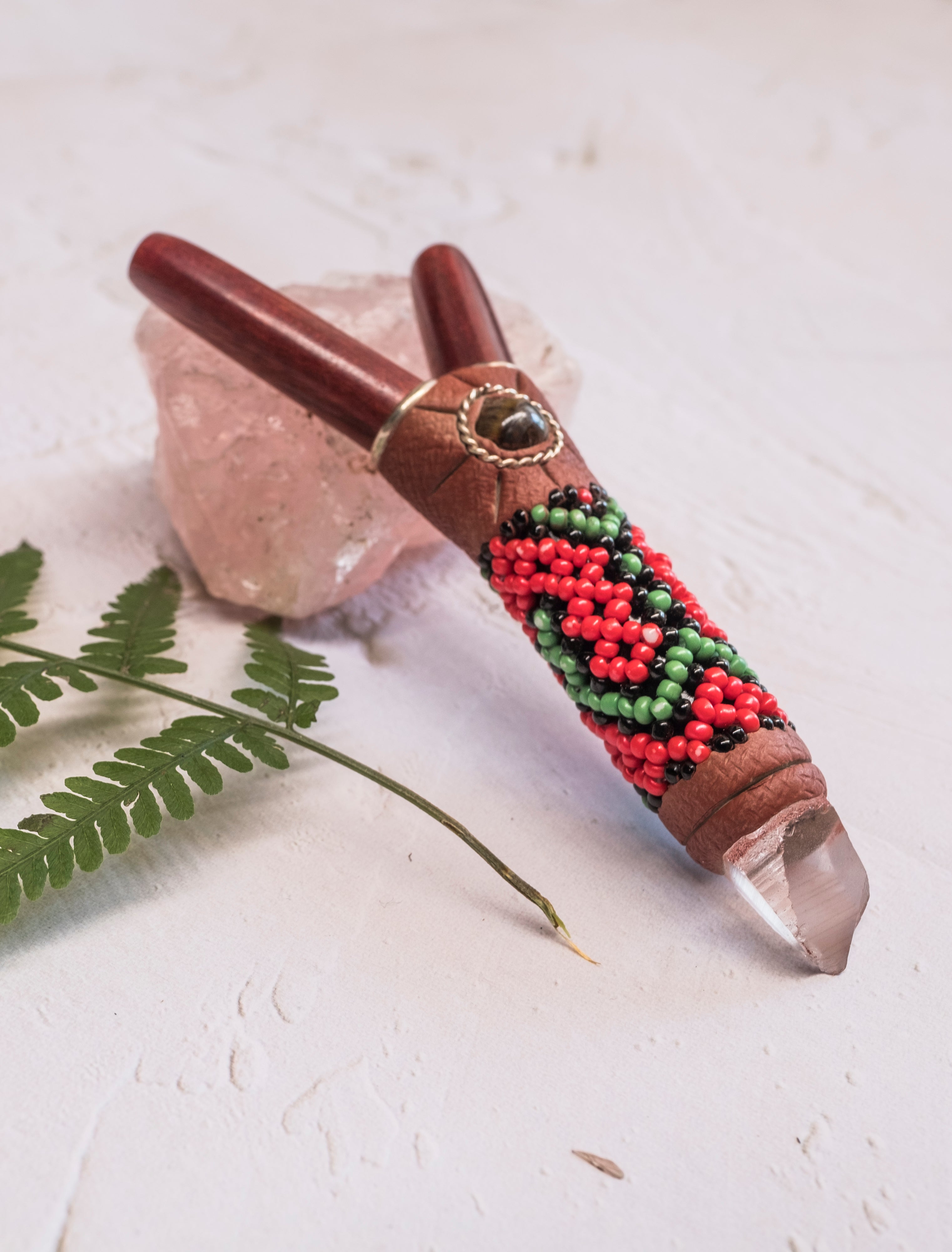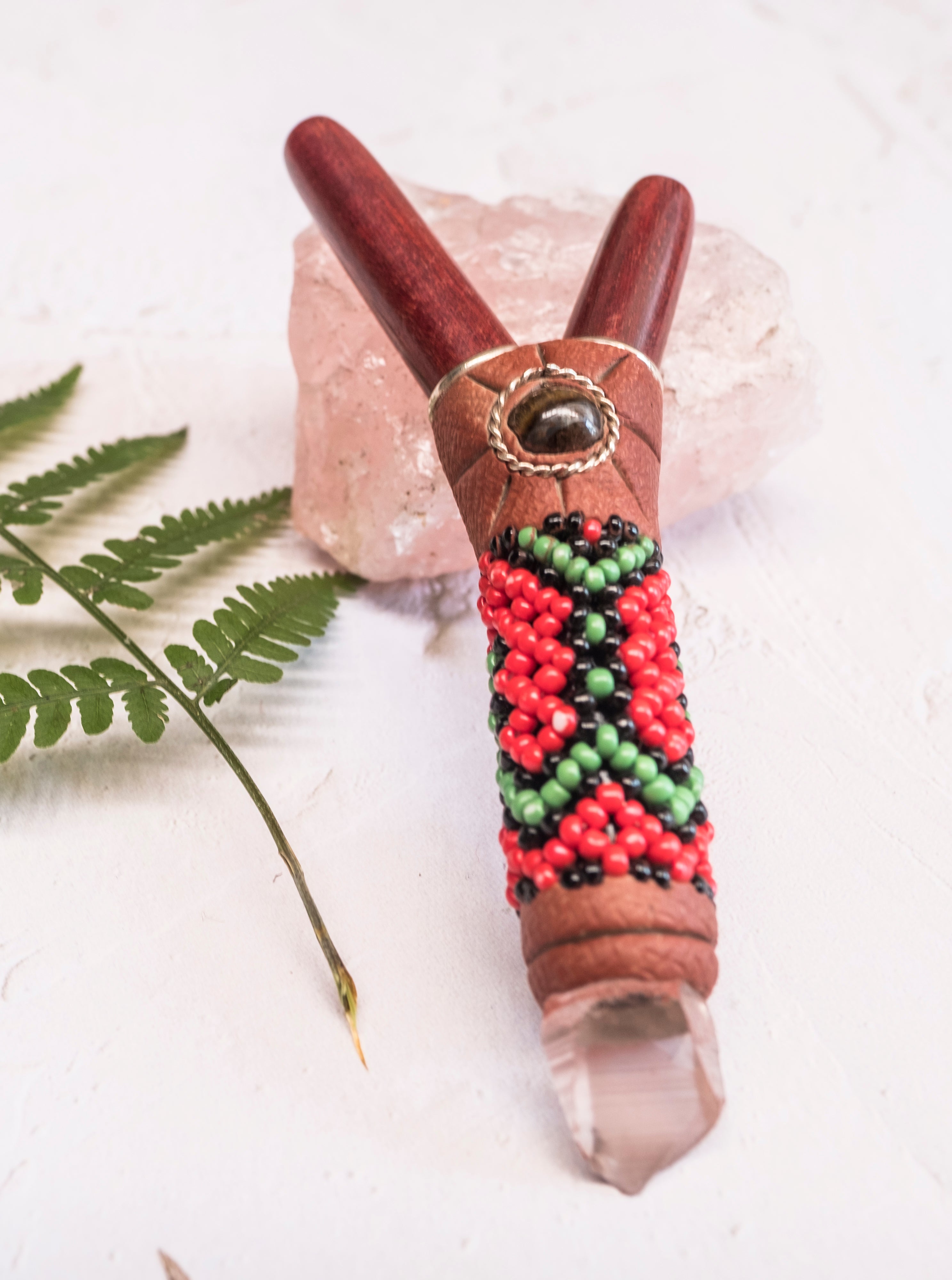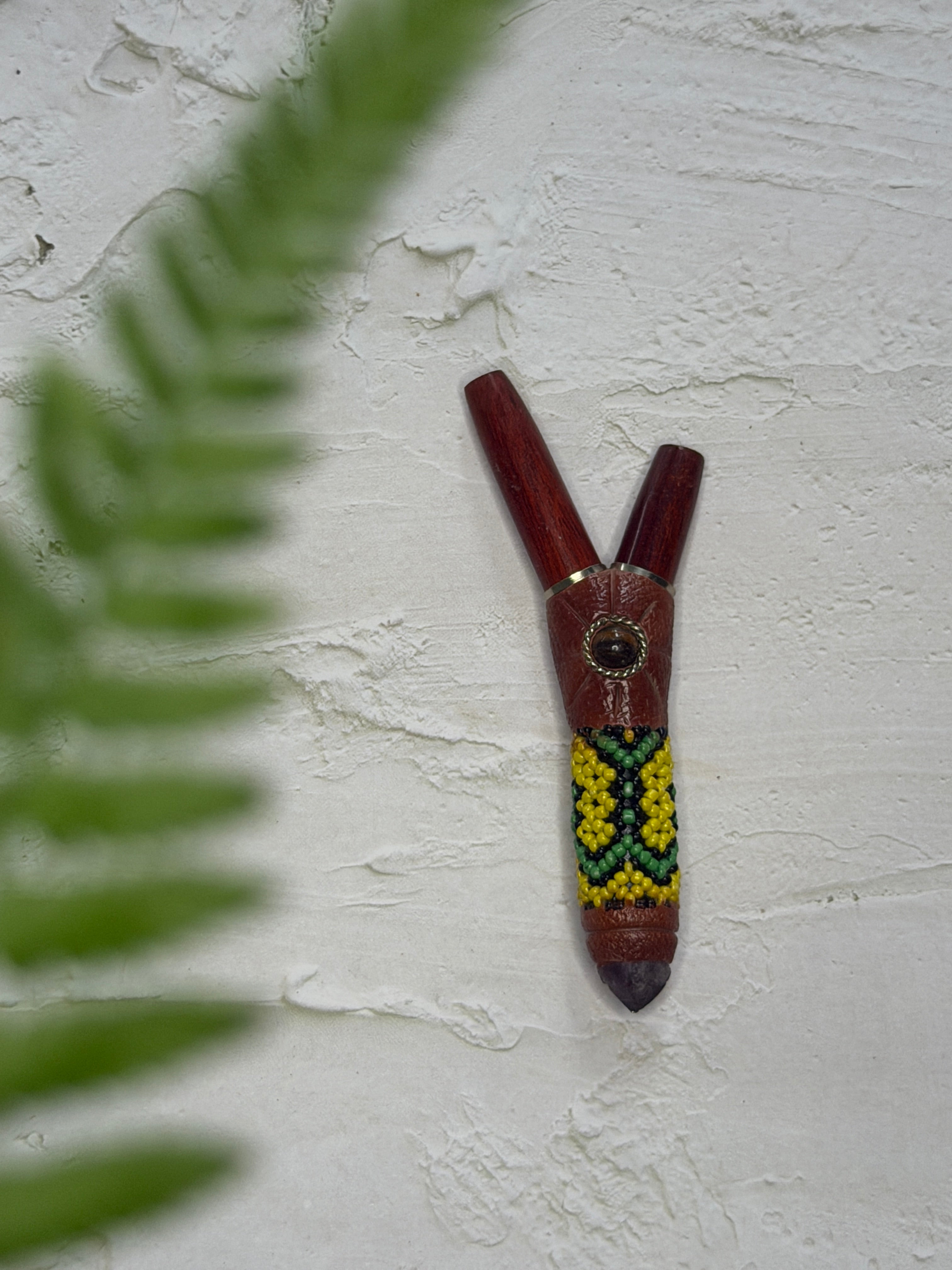Our Shipibo Palo Sangre Kuripes represent an exquisite fusion of Amazonian craftsmanship, combining sacred Palo Sangre wood with intricate Shipibo beadwork. Each piece is carefully crafted through collaboration between skilled wood artisans and Shipibo artists, creating ceremonial tools that unite the grounding properties of Palo Sangre with the healing patterns of Shipibo art.