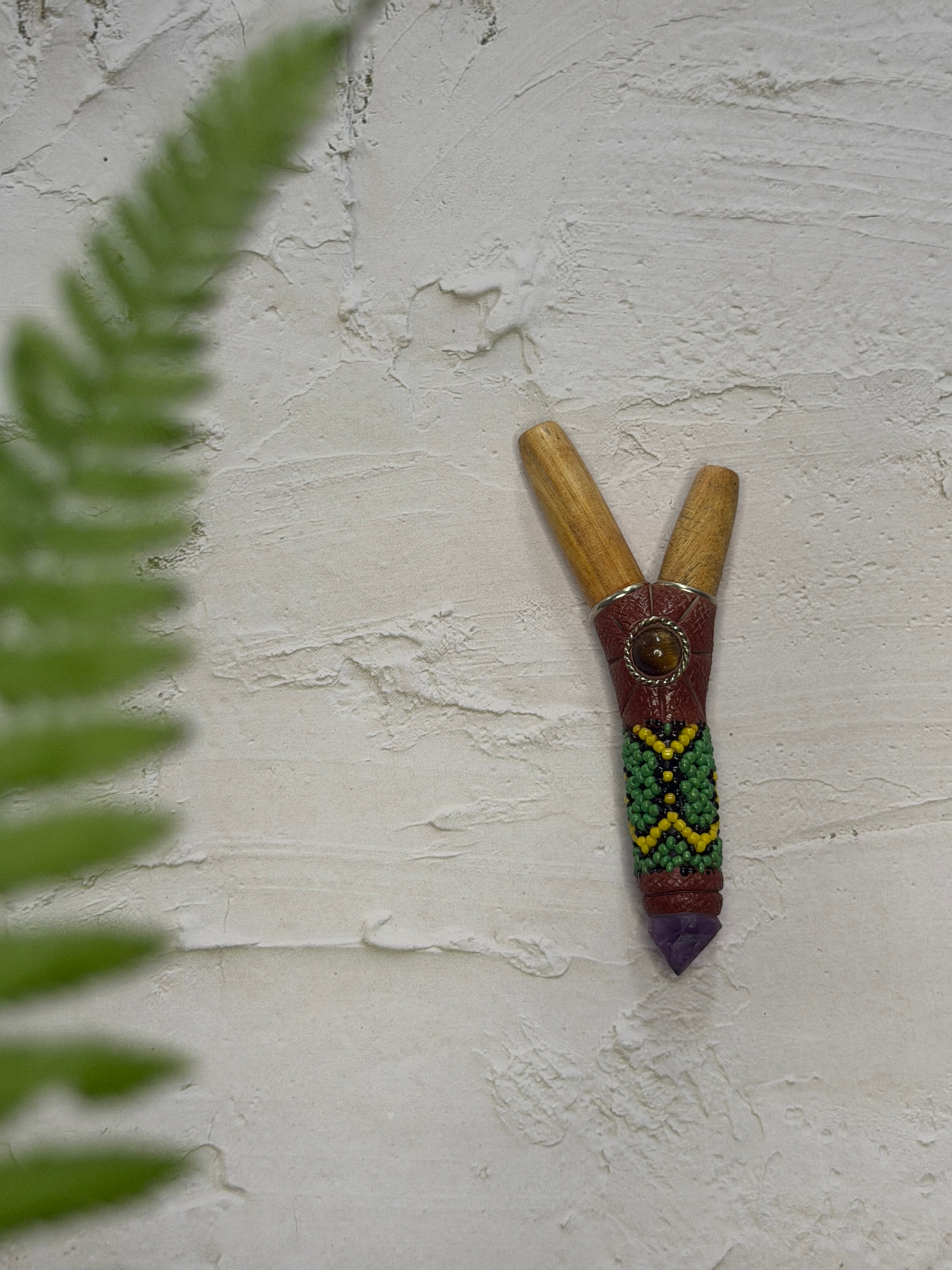 Our Shipibo Palo Santo Kuripes represent a harmonious blend of sacred traditions, combining ethically sourced Palo Santo wood with intricate Shipibo beadwork. Each piece is lovingly crafted through collaboration between skilled wood artisans and Shipibo artists, creating ceremonial tools that unite the purifying properties of Palo Santo with the healing patterns of Shipibo art.